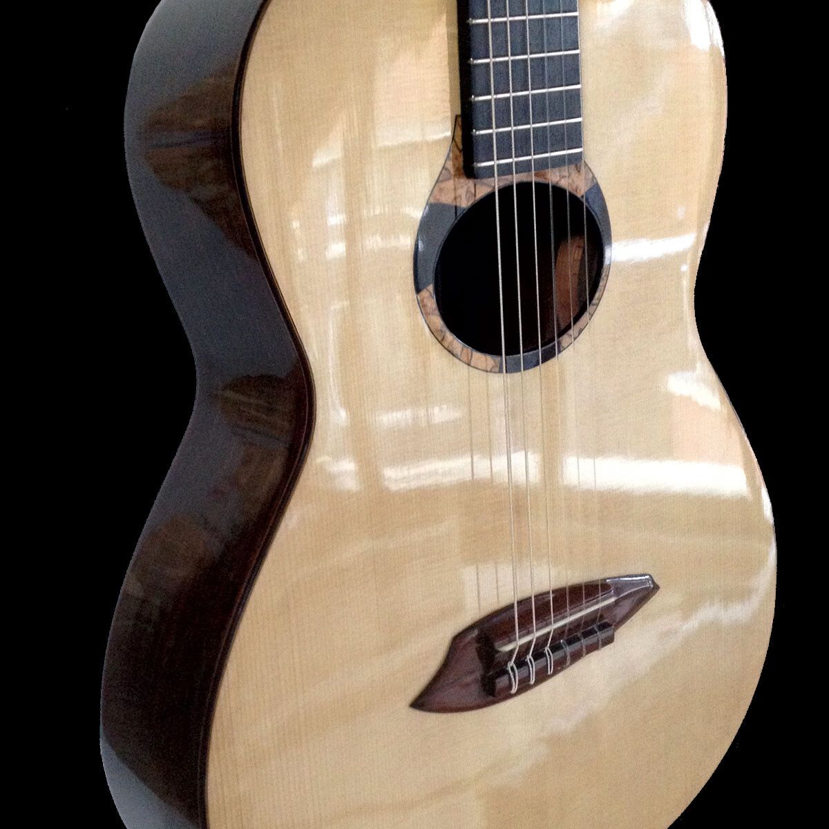 Palissandre : Le « classique » de la guitare classique : Un bois dense et noble, réputé pour ses graves profonds et ses médiums harmonieux, avec une résonance chaleureuse et un caractère unique.