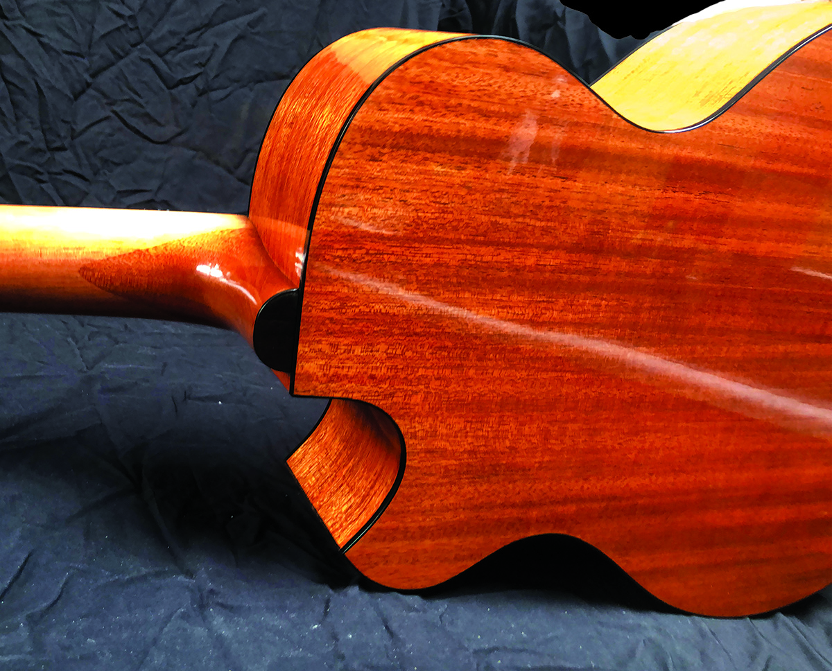 Le dos et les éclisses en acajou apportent à l’instrument une chaleur et une profondeur sonore uniques. L’acajou est un bois dense qui soutient magnifiquement les médiums, tout en offrant un son riche et bien projeté. Il confère à cette guitare une sonorité plus douce et plus ronde, parfaitement adaptée aux nuances subtiles du jazz. La combinaison de l’épicéa et de l’acajou crée un équilibre sonore parfait, avec des basses profondes et une brillance agréable dans les aigus. -